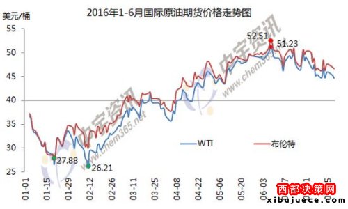 1-6月國(guó)際原油期貨價(jià)格走勢(shì)圖。來源:中宇資訊。