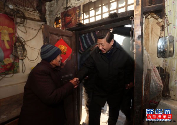 2012年12月29日至30日,中共中央總書記、中央軍委主席習(xí)近平在河北省阜平縣看望慰問困難群眾。這是習(xí)近平在龍泉關(guān)鎮(zhèn)駱駝灣村到困難群眾唐榮斌家看望。新華社記者蘭紅光攝