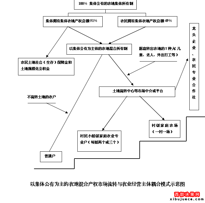 李錄堂向《西部大開發(fā)》介紹,董家?guī)X村示范項(xiàng)目探索建立“以土地集體公有為主,非集體(農(nóng)民)土地所有為輔”的土地集體公有制,通過土地承包經(jīng)營控制權(quán)比例化市場流轉(zhuǎn)試驗(yàn),組建土地股份合作社、家庭農(nóng)場和專業(yè)大戶等經(jīng)營主體,實(shí)行規(guī)?;s化經(jīng)營,進(jìn)而科學(xué)地解決人多地少條件下土地產(chǎn)權(quán)市場化可能產(chǎn)生的社會(huì)不穩(wěn)定因素以及農(nóng)民農(nóng)地產(chǎn)權(quán)自由進(jìn)入和退出問題,讓農(nóng)民“退出土地”有保障,“進(jìn)入土地”有支持,徹底消除農(nóng)民流轉(zhuǎn)土地的后顧之憂,形成“以公有制為主體具有雙重保障的農(nóng)地市場流轉(zhuǎn)機(jī)制”。這一農(nóng)村土地改革的新思路是遵照“以公有制為主體,多種所有制經(jīng)濟(jì)成分并存”的《憲法》原則,借鑒國有企業(yè)劃分國有股、企業(yè)股和企業(yè)全員持股的經(jīng)驗(yàn)及城鎮(zhèn)住房公積金改革的做法,將農(nóng)地產(chǎn)權(quán)(農(nóng)地承包經(jīng)營使用權(quán)等)在集體和農(nóng)民之間按集體占51%,農(nóng)民占49%的比例混合分配后再市場化流轉(zhuǎn)。其中集體所占農(nóng)地產(chǎn)權(quán)及收益總額的51%主要用于農(nóng)民土地社會(huì)保障金和農(nóng)地規(guī)模化公積金,以解決農(nóng)地市場流轉(zhuǎn)過程中失地失業(yè)農(nóng)民的生存和就業(yè)保障問題,其余49%的收益歸農(nóng)民個(gè)人所有,進(jìn)而形成既能保證農(nóng)地集體所有制主導(dǎo)地位,又具有雙重保障和穩(wěn)定性的農(nóng)地產(chǎn)權(quán)市場流轉(zhuǎn)機(jī)制。