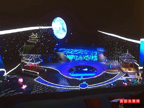 今年秋晚的舞美設計制作本著厲行節(jié)約的原則,對演播現(xiàn)場現(xiàn)有的實景建筑做了最大化的利用。晚會以中國目前最大的仿唐建筑群紫云樓為觀眾席背景,在廣場一側的人工景觀湖上搭建舞臺。舞臺主體通過一幅展開的中國傳統(tǒng)畫軸形象,將西安城墻和大明宮角樓等元素有機地結合到一起,實現(xiàn)臺在水上、水在臺中的夢幻效果,營造出一種穿越千年、貫通古今的浪漫。