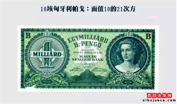 匈牙利帕戈在第二次世界大戰(zhàn)后失去價(jià)值,遭受到紀(jì)錄上有史以來最嚴(yán)重的貨幣貶值,物價(jià)飛漲到了無法控制的地步,計(jì)價(jià)時需要用到極高的位數(shù),面值10垓帕戈的鈔票,舊匈牙利的鈔票,面值是100,000,000,000,000,000,000,也就是10的21次方帕戈(可能紙幣上實(shí)在放不下這么多0,所以面額是用文字表示的)。