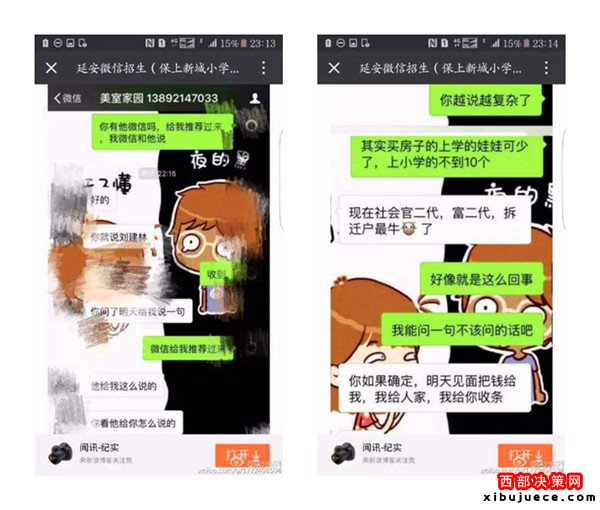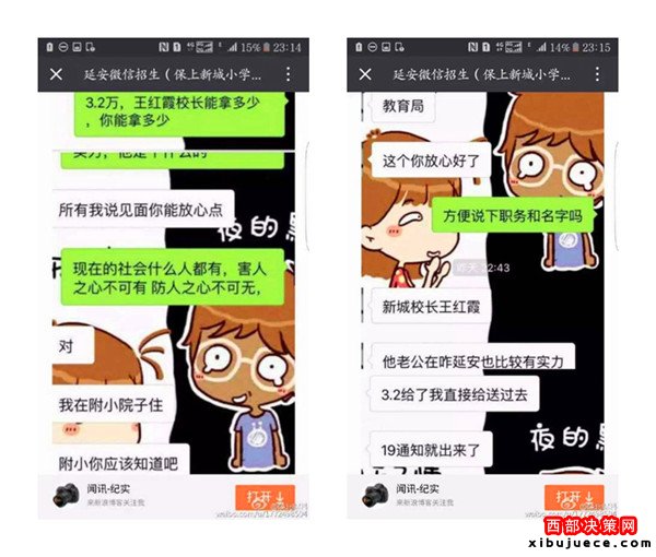 近日,一則題為《延安微信招生(3.2萬(wàn)保上新城小學(xué))請(qǐng)相關(guān)部門(mén)給予調(diào)查公布真相》的帖子在朋友圈瘋傳,內(nèi)容是一位微信名叫“延安微信招生(保上新城小學(xué))”的微友,聲稱只要花3.2萬(wàn)元,保證可以在新區(qū)小學(xué)入學(xué),并解釋有中間人,錢(qián)并不是直接給校長(zhǎng)王紅霞,但愿意提供自己的車號(hào)、身份證號(hào)、家庭住址等信息作為擔(dān)保。3.2萬(wàn)真的能夠保上延安新區(qū)小學(xué)嗎?事情真相究竟如何,記者展開(kāi)調(diào)查。