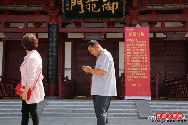 9月11日,西安大唐芙蓉園御苑門(mén)外,雙龍戲珠巨型花壇顯得格外喜慶。緊閉的大門(mén)口貼著閉園公告,因9月15日晚央視在大唐芙蓉園內(nèi)舉辦中秋晚會(huì),9月10日至9月18日期間,大唐芙蓉園臨時(shí)封閉。