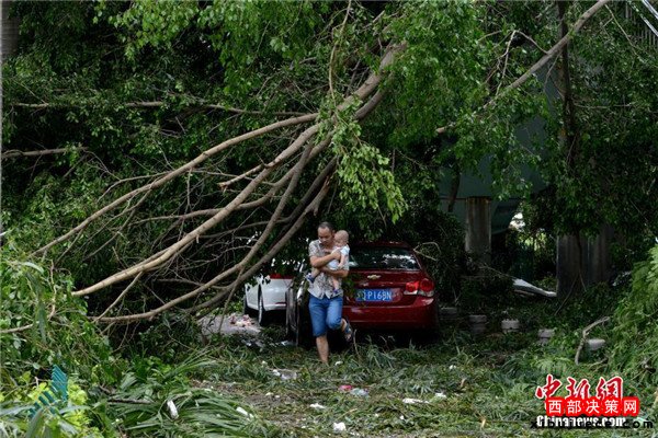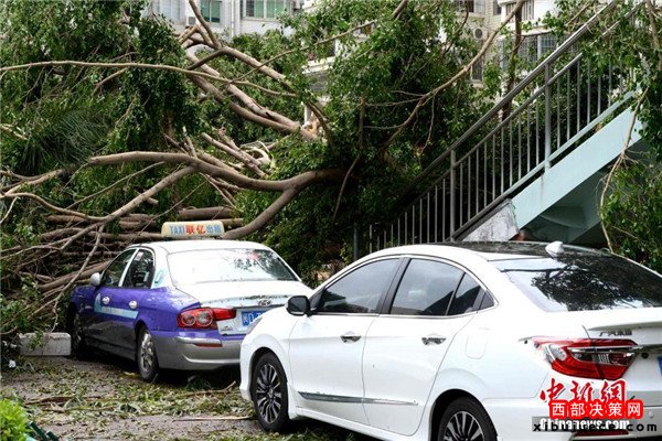 9月15日,今年第14號臺風“莫蘭蒂”于凌晨3時05分在廈門翔安沿海登陸,登陸時中心附近最大風力15級(48米/秒,強臺風級),中心氣壓945百帕。圖為廈門市區(qū)路上大批車輛被吹倒的樹木損壞。