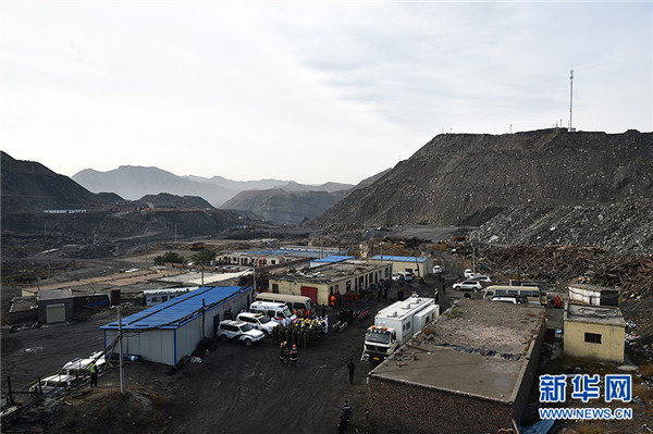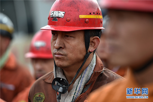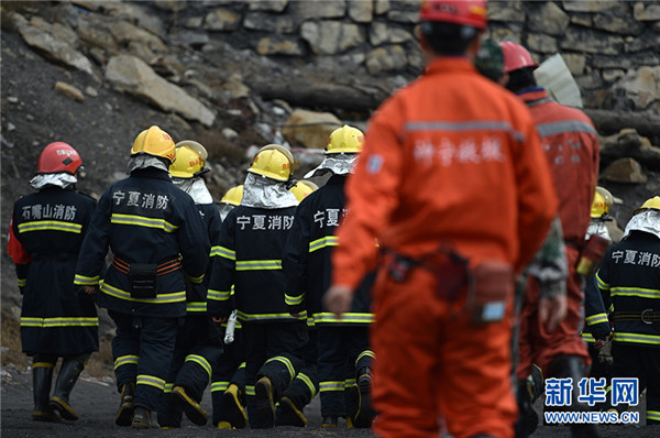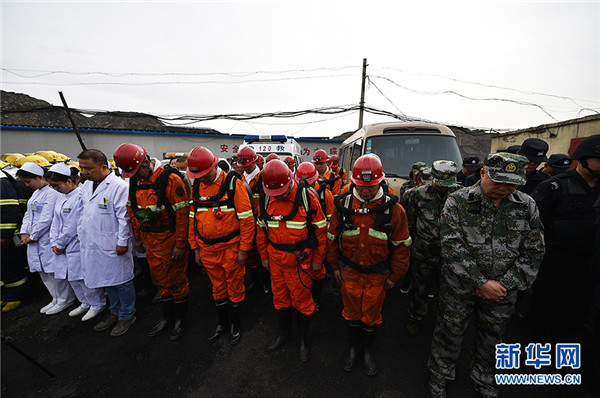 10月11日,在寧夏石嘴山市林利煤礦,現(xiàn)場(chǎng)搜救工作暫停后救援人員進(jìn)行集體默哀。