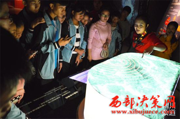 圖為工作人員正為前來參觀的孩子們講解地震知識(shí)。