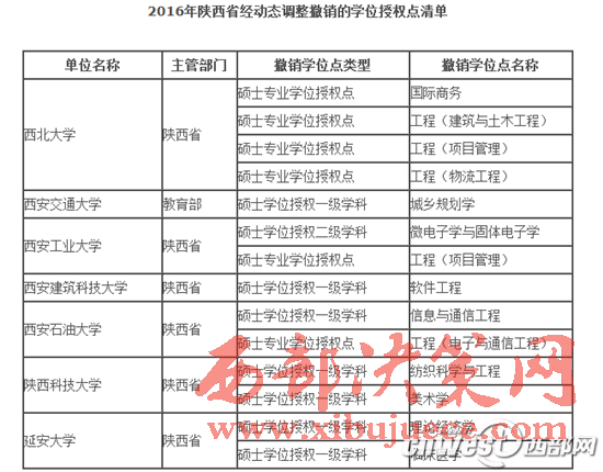 2016年陜西省經動態(tài)調整撤銷的學位授權點清單包括,西北大學的國際商務、西安交通大學的城鄉(xiāng)規(guī)劃學等7所大學的14個碩士專業(yè)學位授權點和碩士學位授權一級學科。
