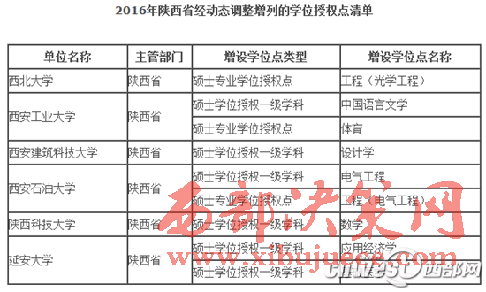2016年陜西省經動態(tài)調整增列的學位授權點清單包括,西北大學的工程(光學工程)、西安建筑科技大學的設計學等6所大學的9個碩士專業(yè)學位授權點和碩士學位授權一級學科。