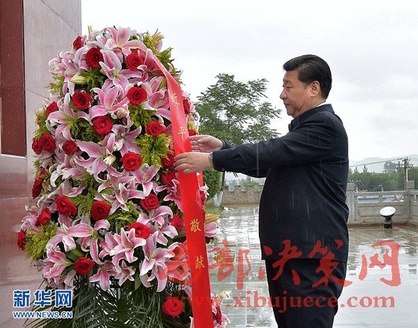 2016年7月18日至20日,中共中央總書記、國家主席、中央軍委主席習(xí)近平在寧夏調(diào)研考察。這是7月18日上午,習(xí)近平在固原市西吉縣將臺堡向紅軍長征會師紀(jì)念碑敬獻花籃。新華社記者李濤攝