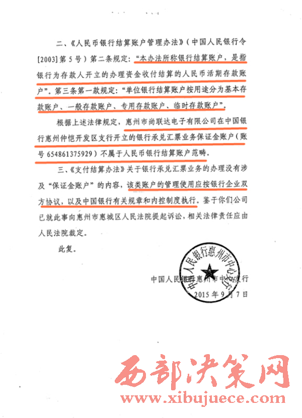 人行惠州分行則認(rèn)定,涉案保證金賬戶不屬于人民幣銀行結(jié)算賬戶管理范籌,無(wú)需經(jīng)當(dāng)?shù)厝嗣胥y行核準(zhǔn)和備案,保證金賬戶的資金劃轉(zhuǎn)、使用在不違反國(guó)家法律、法規(guī)的前提下,由銀行和單位協(xié)商,按協(xié)議辦理。