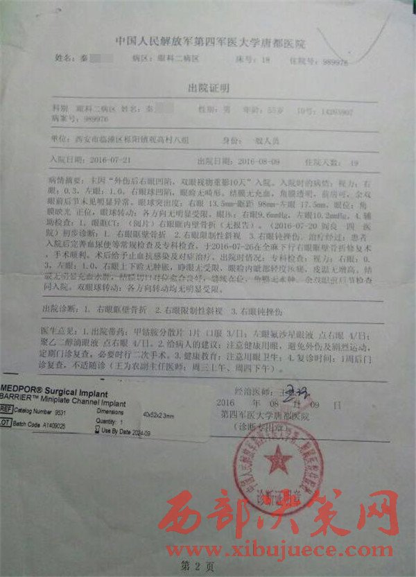 秦見康的出院證明和陜西藍(lán)圖司法鑒定中心的鑒定結(jié)果。秦見康供圖秦見康向澎湃新聞提供的中國人民解放軍第四軍醫(yī)大學(xué)唐都醫(yī)院的出院證明顯示,秦見康7月21日住院,8月9日出院,醫(yī)院診斷結(jié)果顯示其右眼眶壁骨折,右眼限制性斜視,右眼鈍挫傷。陜西藍(lán)圖司法鑒定中心的鑒定結(jié)果顯示,秦見康構(gòu)成輕傷一級。