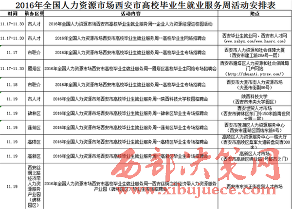 11月17日—11月30日,西安市將舉行2016年全國人力資源市場西安市高校畢業(yè)生就業(yè)服務周。期間將舉辦高校畢業(yè)生網(wǎng)絡招聘大會、現(xiàn)場招聘會、人力資源服務產業(yè)園專場招聘活動等29場招聘會,幫助高校畢業(yè)生找到滿意工作。