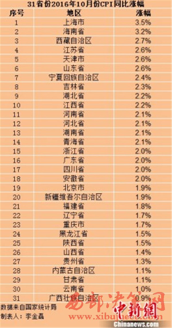 各地10月份CPI漲幅。