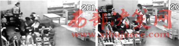 左圖:監(jiān)控28秒,男孩被老師拽摔在地上。右圖:監(jiān)控10秒,老師拎著女孩辮子,隨后將其抱進(jìn)廁所。