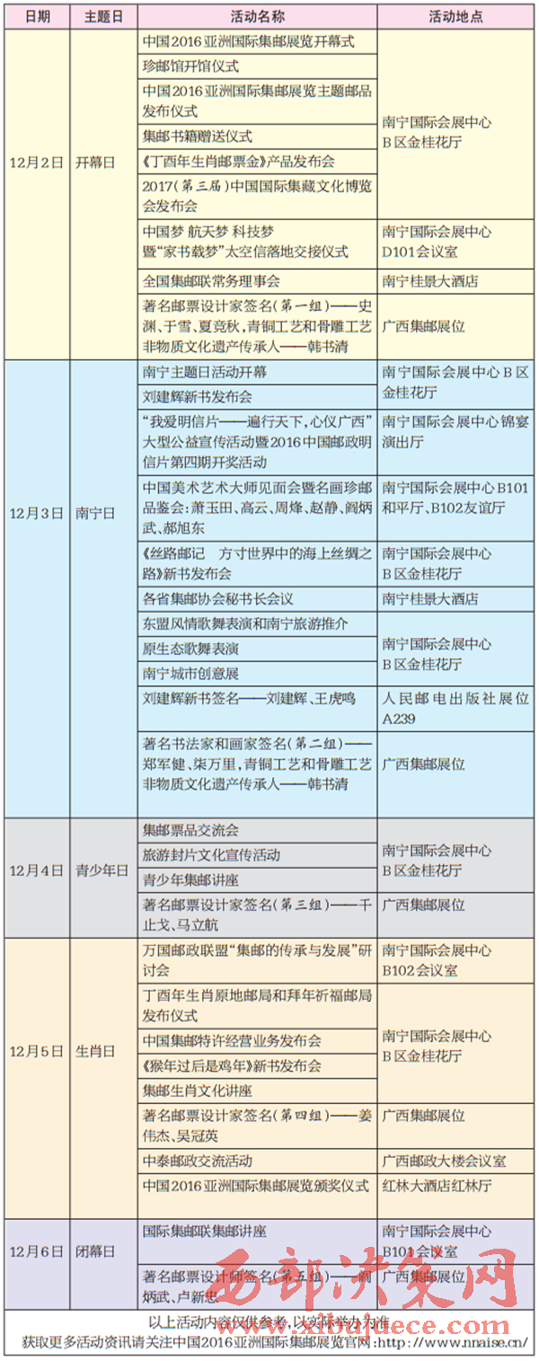 中國2016亞洲國際集郵展覽即將于12月2日—6日在南寧舉行,除了精彩的競賽性和非競賽性展品,郵展期間還將舉辦生肖郵票展示和主題郵局展示等相關(guān)活動。展會還特別設(shè)定了開幕日、南寧日、青少年日、生肖日、閉幕日五個主題日,下面就來看看每個主題日都有哪些豐富的活動吧。