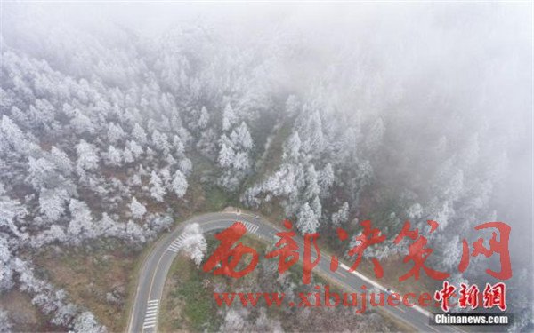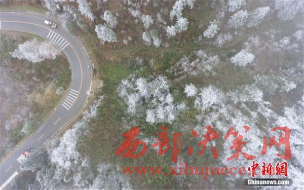 11月24日,航拍雷公山霧凇景觀。據貴州省氣象臺預報,受強冷空氣影響,貴州省大部地區(qū)降溫幅度都在8到16℃之間,部分地區(qū)出現雨夾雪。位于貴州省雷山縣的雷公山國家森林公園出現霧凇景觀,美不勝收。