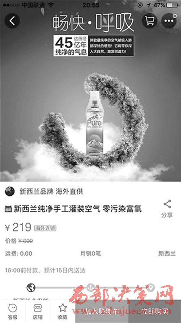那么“空氣”到底屬于什么產(chǎn)品類別呢?“新西蘭純凈手工灌裝空氣”店主表示,有倉庫在新西蘭,但被問及有無商標時,店主只表示是“新西蘭原裝進口”,而在進口的時候是以什么類別進口的呢?店主表示“不清楚。”