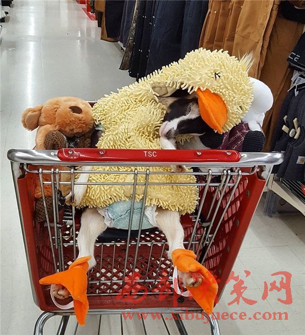 有時候琳恩出門又不能把Polly一個羊扔在家里的時候,就會給小家伙套上鴨子服,帶它出去。被打扮成鴨子的小羊在陌生的環(huán)境里也不再害怕,還在購物車?yán)锎蛄藗€小盹。