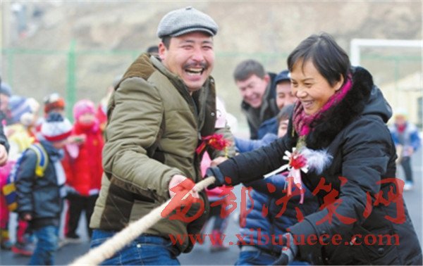 圖為11日,在大浦溝社區(qū)民族團(tuán)結(jié)廣場(chǎng),居民們正在進(jìn)行拔河比賽。