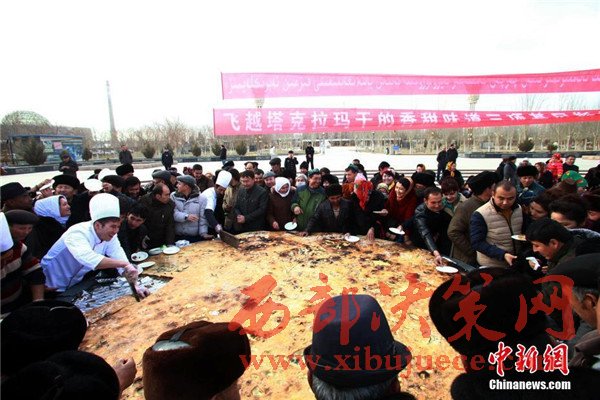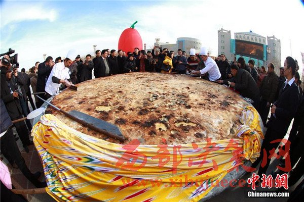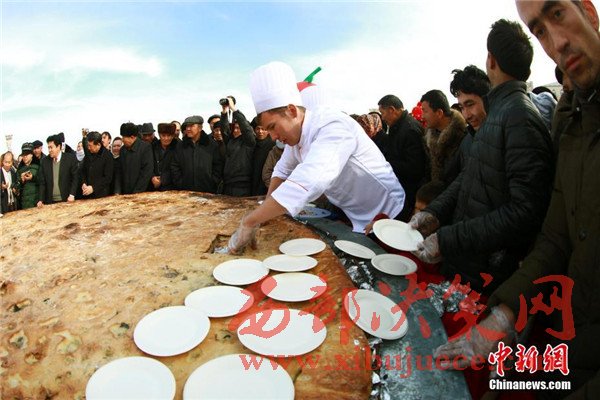 據(jù)悉,庫(kù)麥其是維吾爾族傳統(tǒng)美食,又稱(chēng)且末“大披薩”,用300公斤面粉、200公斤羊肉、60公斤洋蔥,花費(fèi)4個(gè)半小時(shí)制成,直徑達(dá)3.65米,寓意一年365天,天天有肉馕吃。圖為廚師忙著為游客切“最大的庫(kù)麥其”。