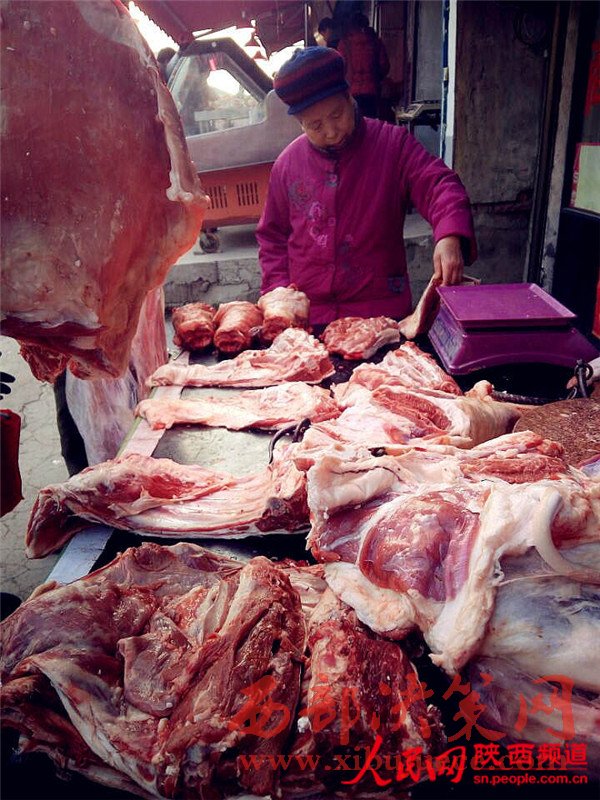 早市上的老人在挑肉