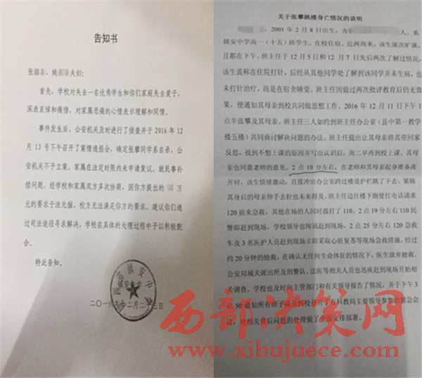 據(jù)墜樓學(xué)生張某母親姚女士悲傷地說:“我兒子于2016年中考以優(yōu)秀的成績考入高中分在高一(15)班,他從小聽話、好學(xué),在小學(xué)、初中名列前茅,因此在高中表現(xiàn)突出,出任班長、團(tuán)支部書記,在校期間學(xué)習(xí)認(rèn)真;在入學(xué)期間中考進(jìn)步明顯由700多名進(jìn)步到305名。自8月20日高中新學(xué)年開學(xué)以來,鎮(zhèn)安縣高中長時(shí)間利用節(jié)假日補(bǔ)課,我兒子連續(xù)四周沒回家,由于天氣變化感冒,曾向老師請假打針,可因?yàn)殄X不夠、沒時(shí)間回家取,白天上完課體力不支、趁晚自習(xí)在宿舍休息、連續(xù)幾天如此;老師沒向家長反映,也沒了解孩子的身體狀況。于2016年12月11日早我接到班主任(祁某虎)電話,讓我到學(xué)校談話、我下午一點(diǎn)左右到鎮(zhèn)安縣中;由我兒子帶到班主任辦公室,路途中我兒子還再三叮囑我、讓我給班主任說好話;在班主任辦公室祁某虎說了我兒子的情況;①張某同學(xué)由中考七百多名進(jìn)步到三百零五名,學(xué)習(xí)成績進(jìn)步明顯;②在班上表現(xiàn)突出,出任班長、團(tuán)支部書記,是一個好學(xué)生;③在本周連續(xù)曠課,需回家反省、停課三天。我讓兒子給班主任當(dāng)面講清為什么曠課,班主任堅(jiān)持的說:‘我不想知道原因,因?yàn)槟愫逦因_我,你態(tài)度惡劣必須嚴(yán)肅處理,不然在班上難以服眾、無法管理其他學(xué)生;必須回家停課、反省、寫保證書,一份給父母、一份給老師、一份自己留著并在全班讀,要夾在書里天天看’;孩子不想回家要上學(xué),不想停課誤了學(xué)業(yè)懇求道:‘我在學(xué)校寫保證書,一定會端正態(tài)度’。孩子再三請求無果,我也懇求留下孩子,可是班主任始終態(tài)度堅(jiān)決,并起身說:‘你不走、我走,不回家反省、不用來上學(xué)’。我兒子攔住班主任準(zhǔn)備下跪請求,班主任訓(xùn)斥道:‘張某、你想咋地’,我兒子說:‘老師你錯了’,可是班主任依然堅(jiān)持;然后我兒子走投無路用無助的目光環(huán)視了我一下,轉(zhuǎn)身就沖出去從五樓跳下;事發(fā)后班主任依然無動于衷,也沒有及時(shí)報(bào)警;當(dāng)時(shí)一高三學(xué)生說:‘趕快報(bào)警’,一老師說:‘這沒你的事趕快回教室’。事后學(xué)校第一次與親屬談話;城關(guān)派出所通報(bào)了案情,班主任祁某虎講述了事情經(jīng)過說他讓我兒子回家反省,是他的一貫教學(xué)手段;他作為班長行為惡劣,不拿他作為教育榜樣,無法教育好其他學(xué)生,有起殺一儆百的作用。第二次談話說,家屬要求給一個交代、追究相關(guān)人責(zé)任,學(xué)校最后表面管的稱;①不怕家屬上訪、②不怕借助媒體報(bào)道討說法、③不怕經(jīng)過司法來告狀。在此期間我們找過主管教育的朱縣長稟明此事,朱縣長表示沒有接到真實(shí)上報(bào),對事情不了解,他會嚴(yán)肅處理、并電話責(zé)令龍校長嚴(yán)格對待處理此事??墒鞘嗵爝^去,學(xué)校依然沒有任何處理,態(tài)度強(qiáng)硬、用各種手段施壓;至25日14時(shí),學(xué)校給我們親屬安排在鎮(zhèn)安縣開元酒店的房子,也責(zé)令酒店收回將我們都趕出來了,在這雪雨交加的天氣我們該何去何從,孩子的遺體還在殯儀館我們該怎么辦”。