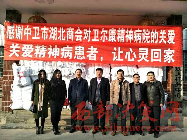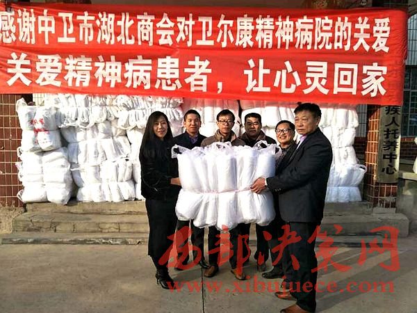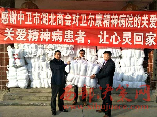 西部決策網(wǎng)訊(黃貞 楊新)2017年1月9日,中衛(wèi)市湖北商會一行數(shù)人在會長朱秀東的帶領(lǐng)下,前往中衛(wèi)市衛(wèi)爾康精神病醫(yī)院進行新年前慰問,并送去價值2萬余元的過冬棉被。