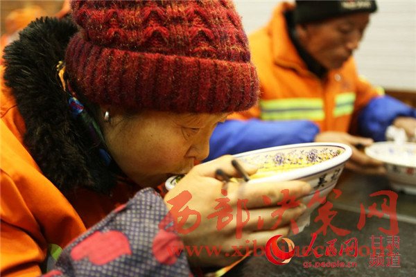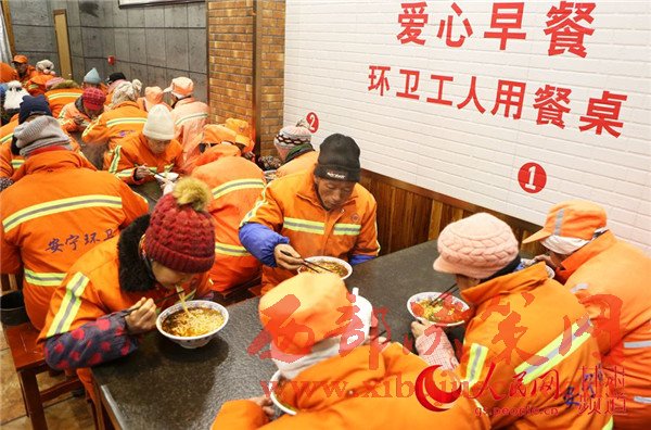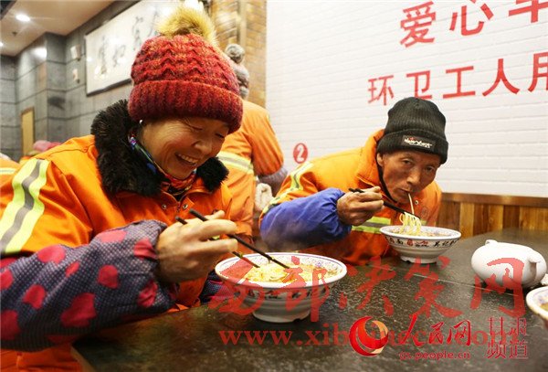 19日,蘭州環(huán)衛(wèi)工在一家牛肉面店享用愛心早餐。