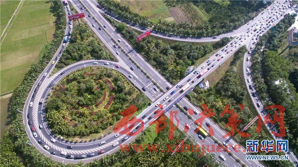 1月29日,海南省瓊海市高速公路出入口擠滿了新春出行的車輛。