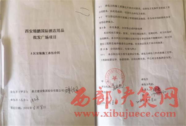 西部決策網(wǎng)訊(王博 通訊員 王德)近期,我社不斷接到汪衛(wèi)宏來電、來信稱;2014年4月底,鼎立建設(shè)集團(tuán)股份有限公司西安分公司找到我;讓我?guī)Чと嗽?lsquo;西安錦鵬國際酒店用品批發(fā)廣場項(xiàng)目’干水、電安裝,至今拖欠民工一百多萬工資款;發(fā)包方和業(yè)主雙方相互推諉。