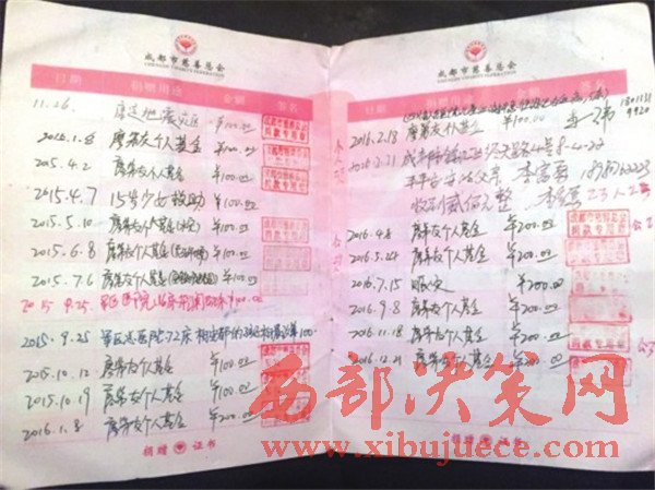 從賑災捐款,到為愛助醫(yī),從公眾熟知的“提燈女孩”王思培,到無人注意的早產雙胞胎,成都慈善總會為廖弟友發(fā)放的捐款證書上,每一頁都記著受助者的名字和個人基金的用途。翻看捐款證書,僅從2011年3月到2016年12月這段時間內,廖弟友的捐款次數(shù)達到58次,最近一次是2016年12月存入個人慈善基金的記錄。