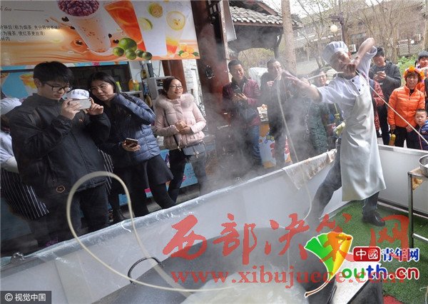 "我當(dāng)時(shí)就想著搞點(diǎn)花樣,來(lái)招攬客人。"田波告訴記者,一開始他只是簡(jiǎn)單地扭幾個(gè)動(dòng)作,把原來(lái)扯面的動(dòng)作,變得更花哨。