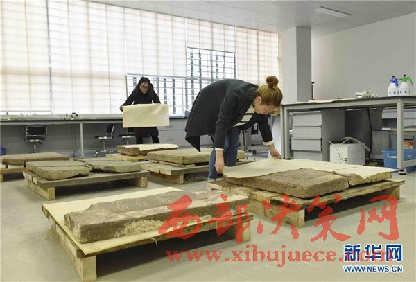 2月27日,成都考古研究所文物保護與修復中心工作人員在對清洗干凈的墓志進行防塵保護。