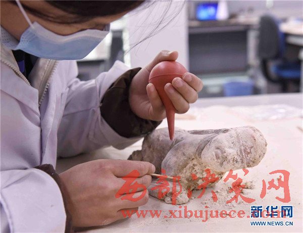 2月27日,成都考古研究所文物保護與修復中心工作人員在對出土文物進行清理
