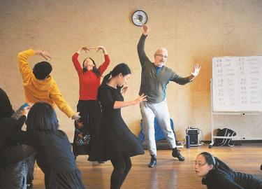茲維卡(右)指導(dǎo)學(xué)員伴隨著音樂的節(jié)拍進行舞動。