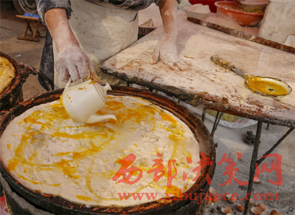 在餅上雙面澆油,熟透了以后會(huì)金黃金黃的。