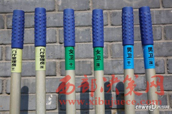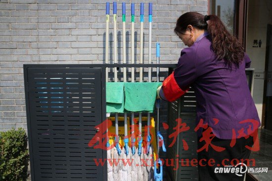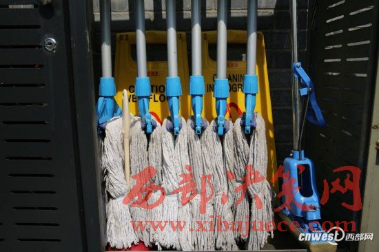 3月8日,西安環(huán)城公園一公廁門(mén)口的拖布柜里整整齊齊放著全套拖布,有男衛(wèi)、女衛(wèi)、門(mén)廳管理房專(zhuān)用的干濕拖布。