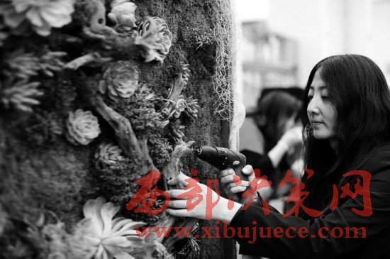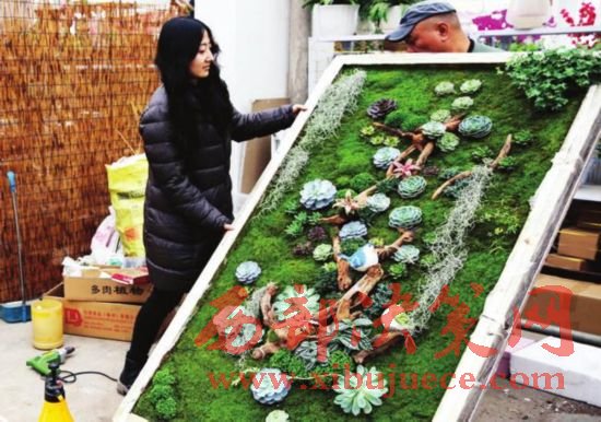 3月13日,西安北二環(huán),經過何萌努力創(chuàng)作的這幅多肉風景畫已經完成。記者看到,整幅畫作高1.9米,寬1米,用60多棵多肉植物及其它綠植組合。何萌說:“我大學學的是設計,畢業(yè)后做過平面設計,因為喜歡多肉植物便辭掉工作,自己開店賣多肉植物。時間長了總覺得一個一個賣,不但利潤少,也缺乏創(chuàng)意,于是就自己畫畫、寫毛筆字,以設計稿的方式完成多肉畫作的線稿設計。”從開始的組裝花盒到現在將多肉做成畫,何萌都全力以赴。