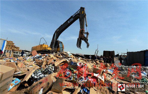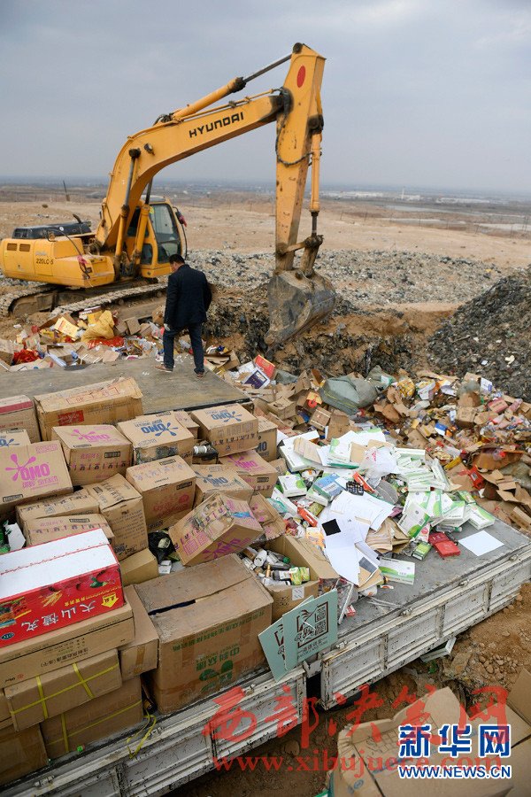 3月14日,在寧夏寧東垃圾填埋場(chǎng),工作人員將假冒偽劣商品進(jìn)行填埋處理。“3·15”國際消費(fèi)者權(quán)益日即將到來之際,銀川市市場(chǎng)監(jiān)督管理局集中展示并銷毀食品、藥品、電器等32個(gè)類別的假冒偽劣商品。