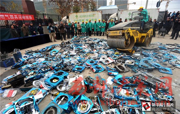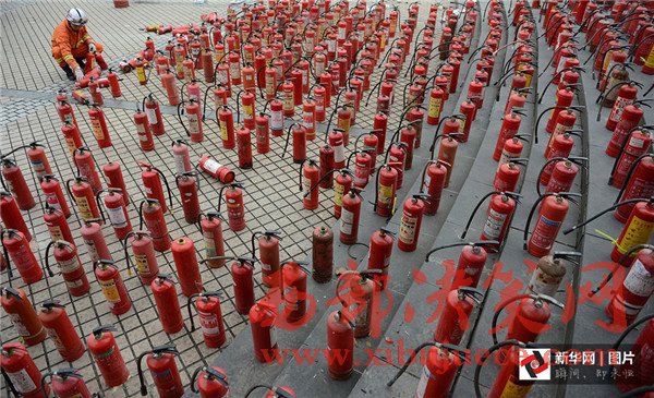 2012年11月6日,四川省成都市,一批假冒偽劣的消防滅火器被銷毀。當(dāng)日,四川省“119”消防宣傳周啟動(dòng)暨消防產(chǎn)品形式安檢公開處理假冒偽劣消防器材產(chǎn)品集中銷毀儀式在成都舉行。