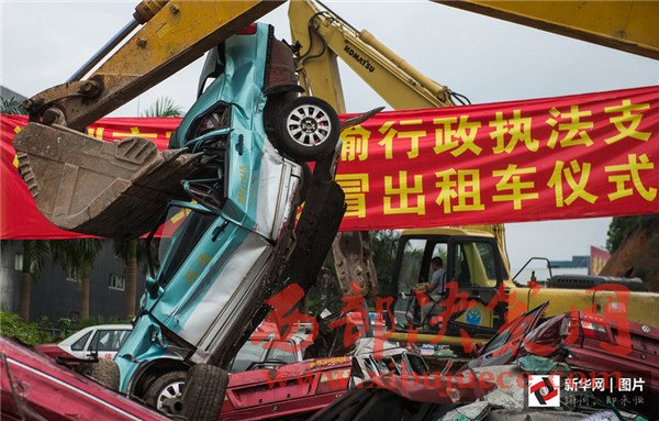 2016年6月16日上午,廣東深圳,深圳市交通運(yùn)輸行政執(zhí)法支隊(duì)在觀瀾大富扣車場(chǎng)舉行公開銷毀假冒出租車儀式,對(duì)查扣的484輛假冒出租車依法、公開、集中進(jìn)行銷毀。圖為銷毀現(xiàn)場(chǎng),假“的士”在挖掘機(jī)的巨臂下變成廢鐵。