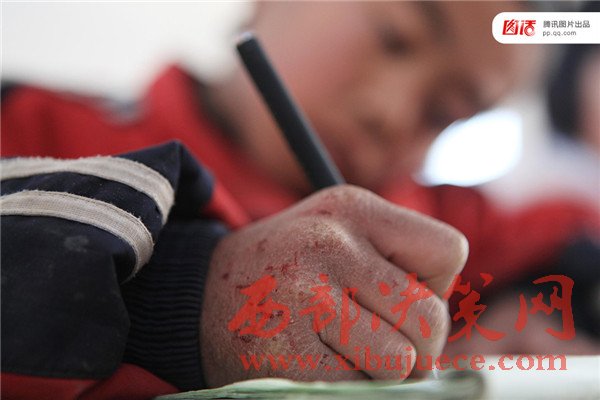 圖為2011年12月28日,山西省長(zhǎng)治市沁縣池堡寄宿小學(xué),一名手凍裂口的小學(xué)生在寒冷的教室內(nèi)寫作業(yè)。