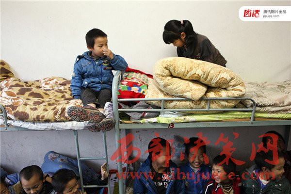 教育公益組織歌路營(yíng)的數(shù)據(jù)顯示我國(guó)基礎(chǔ)教育階段寄宿制學(xué)生數(shù)量達(dá)3276萬(wàn),其中60%是留守兒童。2015年,歌路營(yíng)發(fā)布了《中國(guó)農(nóng)村住校生調(diào)查報(bào)告》,在走訪了幾百所農(nóng)村寄宿校后,報(bào)告用“擠、險(xiǎn)、臭”來(lái)形容農(nóng)村孩子糟糕的住宿環(huán)境。圖為2012年11月,浙江松陽(yáng)縣大東壩鎮(zhèn)中心學(xué)校,住校的人太多床鋪緊張達(dá)不到一人一床的標(biāo)配,常常安排兩個(gè)孩子睡在一起。