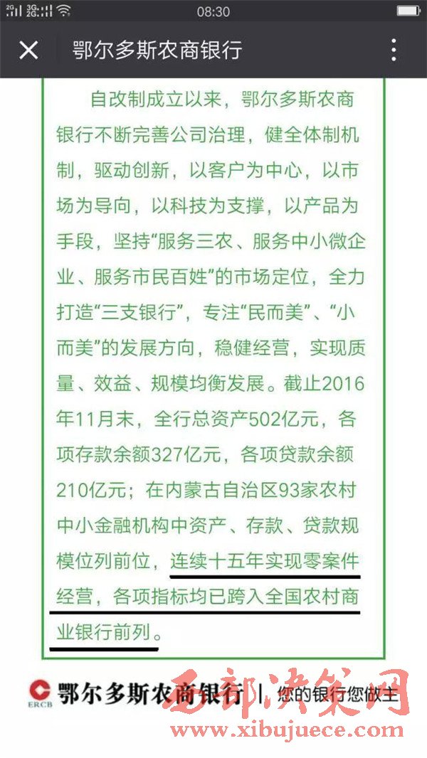 鄂爾多斯農(nóng)商銀行官方微信平臺(tái)2016年12月22日發(fā)布文章中稱:鄂爾多斯農(nóng)商銀行自改制成立以來,連續(xù)十五年實(shí)現(xiàn)零案件經(jīng)營,各項(xiàng)指標(biāo)均已跨入全國農(nóng)村商業(yè)銀行前列。