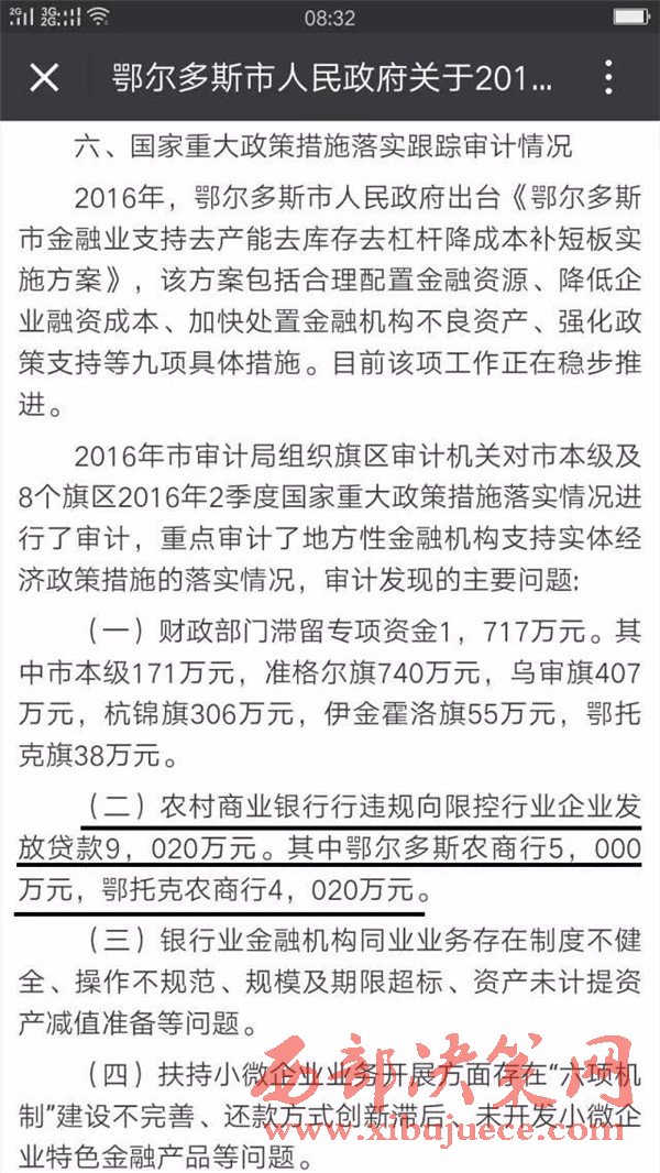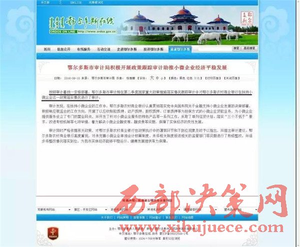 鄂爾多斯市人民政府網(wǎng)站刊登文章中稱:按照審計(jì)署統(tǒng)一安排部署,鄂爾多斯市審計(jì)局在第二季度國家重大政策措施落實(shí)情況跟蹤審計(jì)中對(duì)鄂爾多斯農(nóng)村商業(yè)銀行在扶持小微企業(yè)這一政策落實(shí)情況進(jìn)行了審計(jì)。