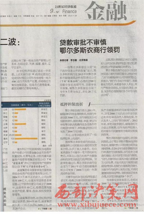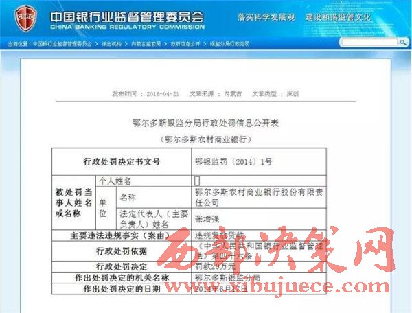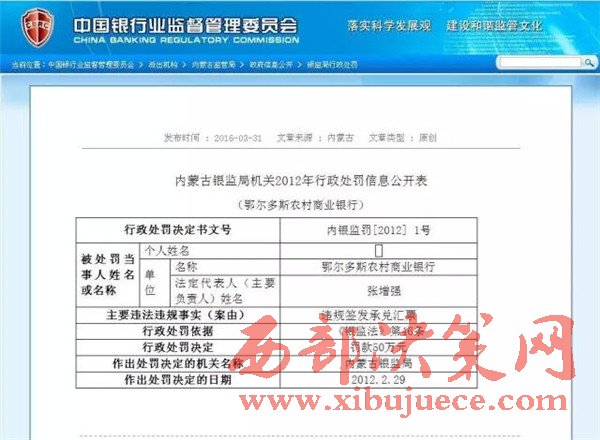 另查明:鄂爾多斯農(nóng)村商業(yè)銀行法人張?jiān)鰪?qiáng),又是內(nèi)蒙古信用聯(lián)合社理事會(huì)理事,共產(chǎn)黨黨員,管理不善,多次因非法經(jīng)營舉報(bào),其中2012年2月29日,因違規(guī)簽發(fā)承兌匯票被內(nèi)蒙古銀監(jiān)局罰款50萬。