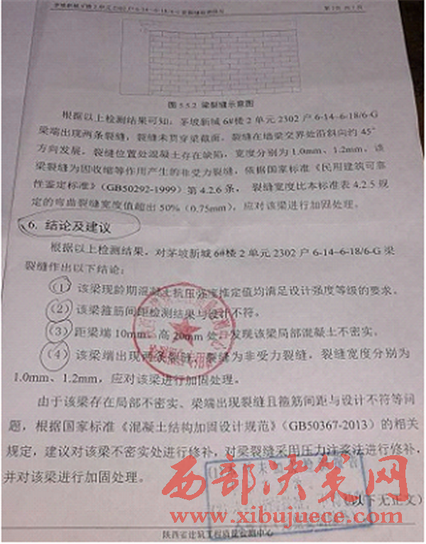 最早有兩戶村民投訴舉報,小區(qū)的物業(yè)公司出資委托陜西省建筑工程質(zhì)量檢測中心進(jìn)行鑒定,結(jié)論如下: