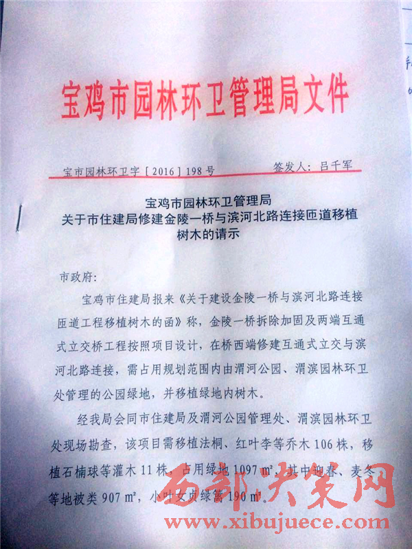 寶雞市人民政府副市長王琳于2017年1月4日做出了批復:“擬同意市園林環(huán)衛(wèi)局意見,建議由市住建局做好涉及苗木移植,市園林環(huán)衛(wèi)局做好移植監(jiān)督檢查和技術把關,確保樹木成活”。