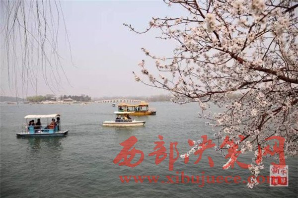 游客們在北京頤和園賞花。