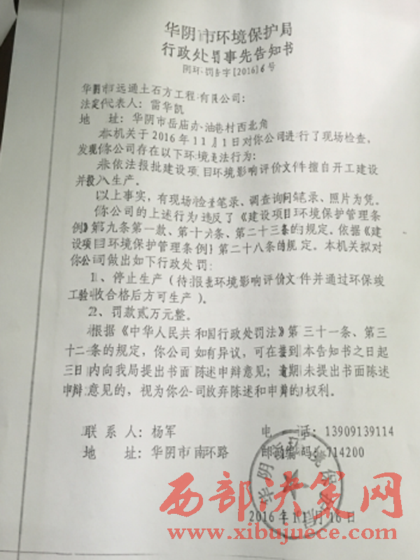 一份2016年11月23日《華陰市環(huán)境保護(hù)局行政處罰決定書(shū)》復(fù)印件顯示,環(huán)保局于2016年11月1日對(duì)該公司進(jìn)行了現(xiàn)場(chǎng)檢查,發(fā)現(xiàn)該公司存在未依法報(bào)批建設(shè)項(xiàng)目環(huán)境影響評(píng)價(jià)文件擅自開(kāi)工建設(shè)并投入生產(chǎn)。處罰是停止生產(chǎn)和罰款2萬(wàn)元。